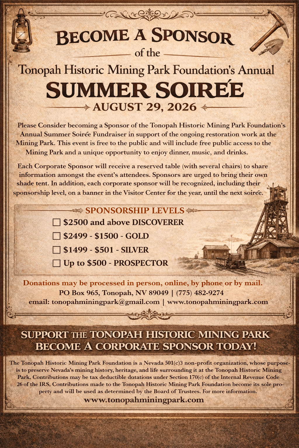 A membership to the Tonopah Historic Mining Park Foundation delivers news of the Park and Town of Tonopah to you, along with various and interesting pieces about our local history.