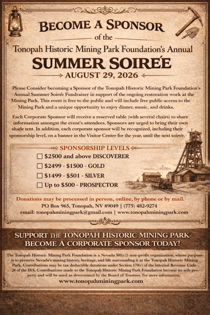 Join us for the 2026 Annual Summer Soirée benefiting the Tonopah Historic Mining Park on Saturday, August 29, 2026